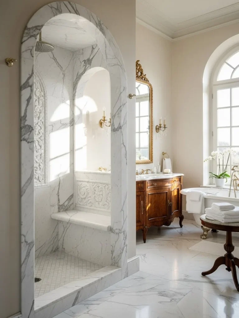 This bathroom incorporates an arched marble shower, referencing the architectural language of palazzi and Roman baths. The arch establishes hierarchy and frames the bathing function with architectural dignity.