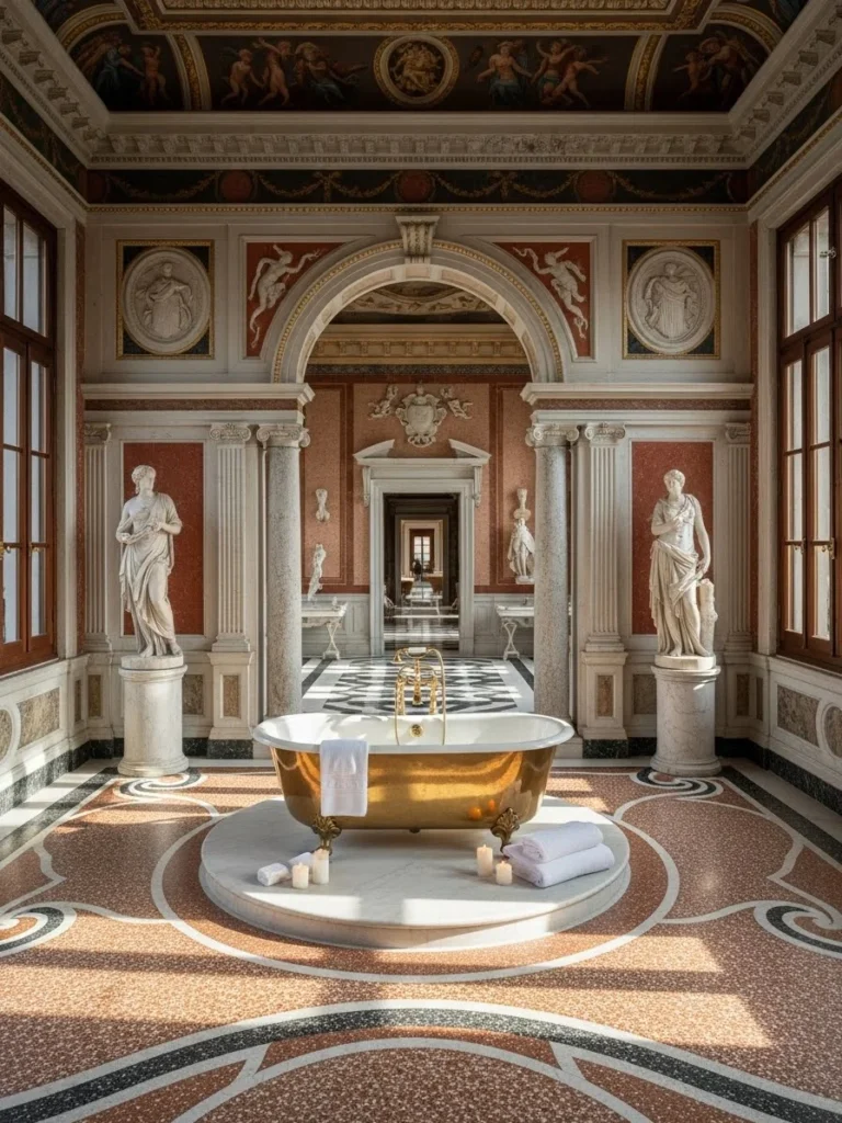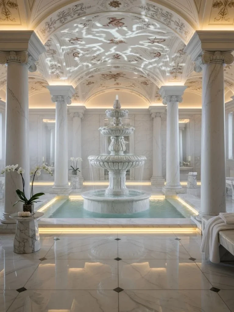 This bathroom integrates an indoor fountain, drawing from Renaissance and Roman traditions where water was both functional and symbolic. The fountain acts as a spatial anchor, organizing surrounding bathing elements.