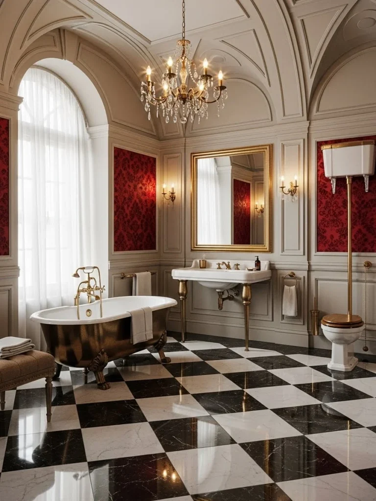 This bathroom uses checkerboard marble flooring as a defining architectural feature, historically associated with palatial and ecclesiastical interiors. The pattern establishes rhythm and spatial order.