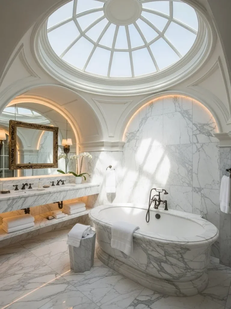 This bathroom centers on a domed skylight, a form derived from Roman and Renaissance architecture. The skylight introduces natural illumination from above, creating a calm and evenly lit environment.