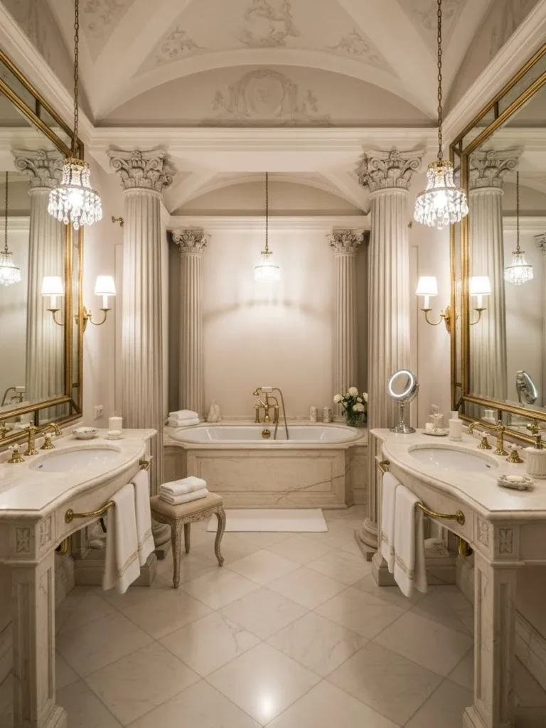 This bathroom is defined by bilateral symmetry, a key principle of palatial planning. Twin vanities are positioned opposite one another, reinforcing balance and hierarchy within the space.
