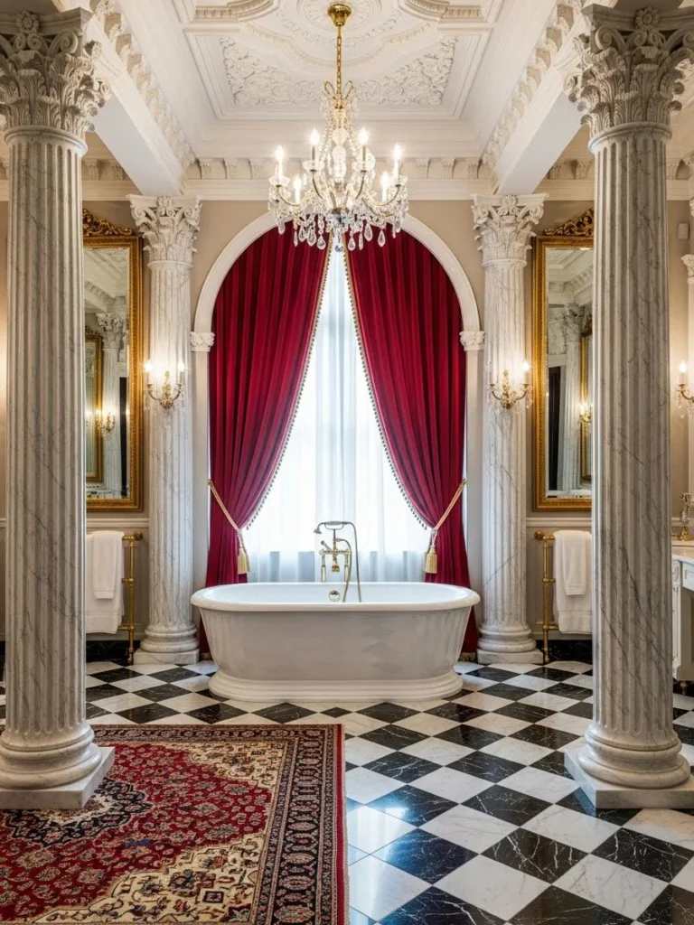 Palace-Inspired Bathroom With Roman Columns And Checkerboard Marble Floors