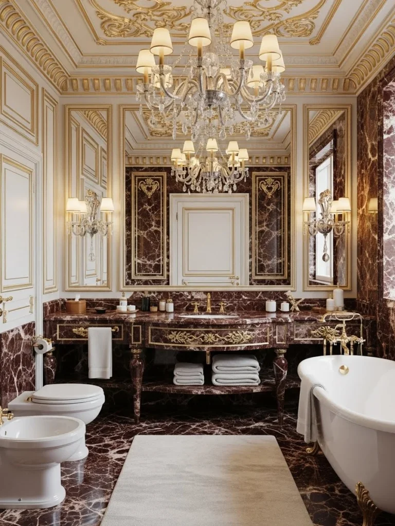 Despite its ornamentation, the bathroom avoids visual chaos through strict proportional logic. The result is an interior that communicates power, ceremony, and sophistication while remaining architecturally coherent and historically grounded in palatial Baroque tradition.