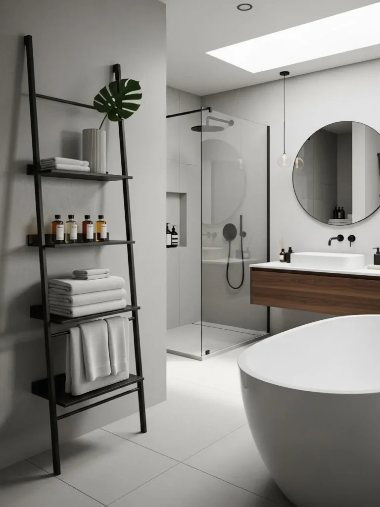 Chic ladder shelves prove that vertical storage can be both practical and visually appealing. They transform a tiny bathroom into an organized, sophisticated space, balancing functionality with high-end design in a way that feels effortless and luxurious.