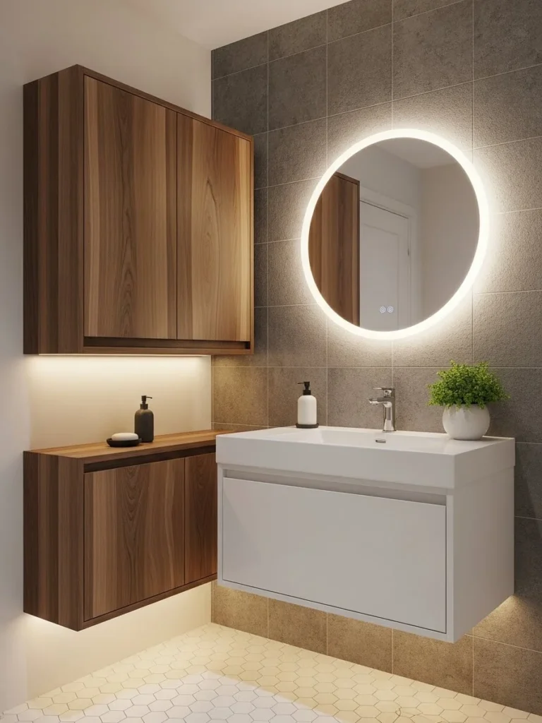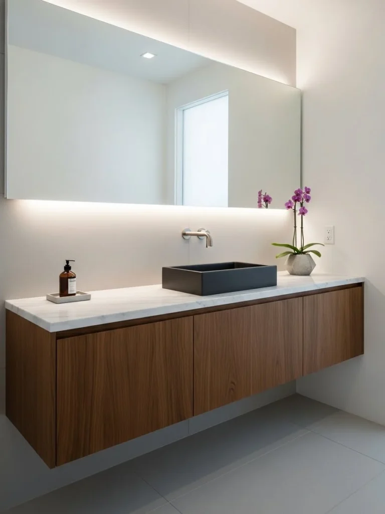 Soft-close drawers and handle-free designs enhance the sleek look, while LED lighting underneath the vanity adds a subtle glow that expands visual space and introduces a spa-like ambiance. Floating vanities also make cleaning simpler, a practical benefit in tight quarters.