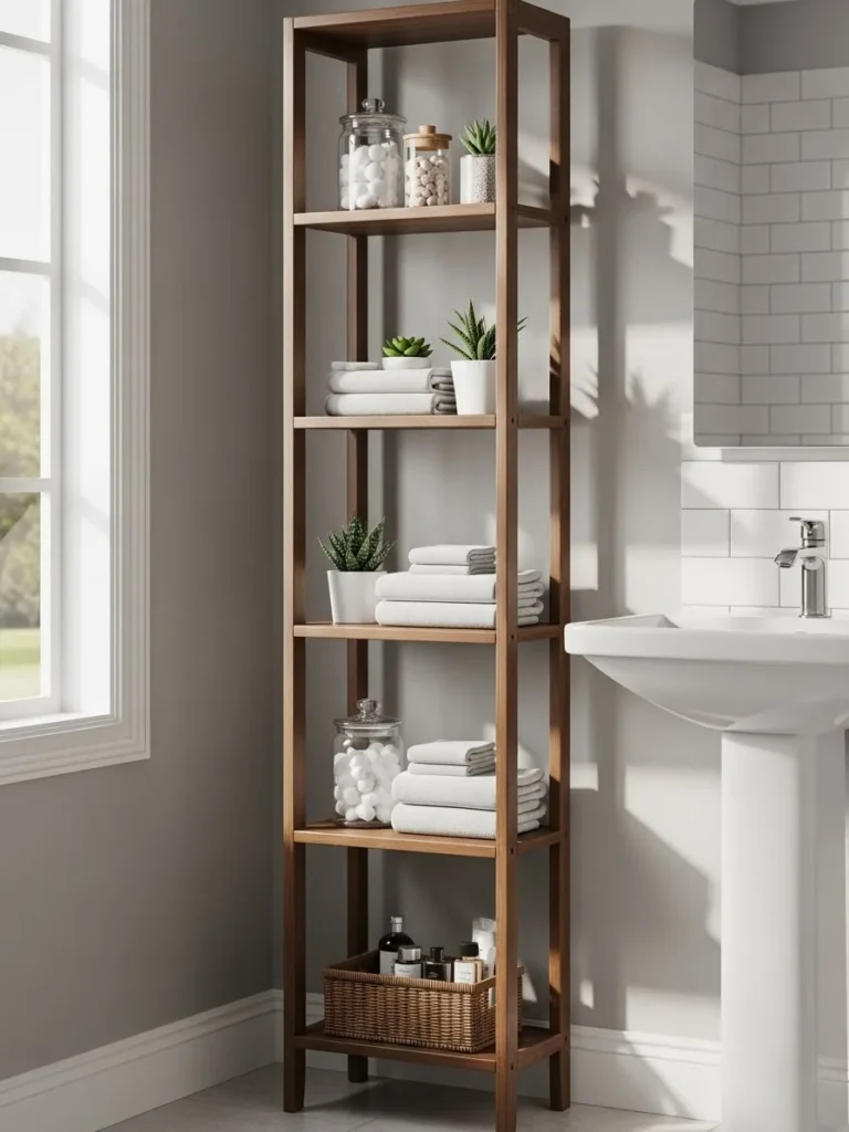 When floor space is limited, going vertical is the ultimate storage strategy. Tall, narrow shelving units utilize wall space efficiently, creating a luxurious display area without crowding a tiny bathroom. Materials like polished wood, glass, or metal frames add elegance and durability.