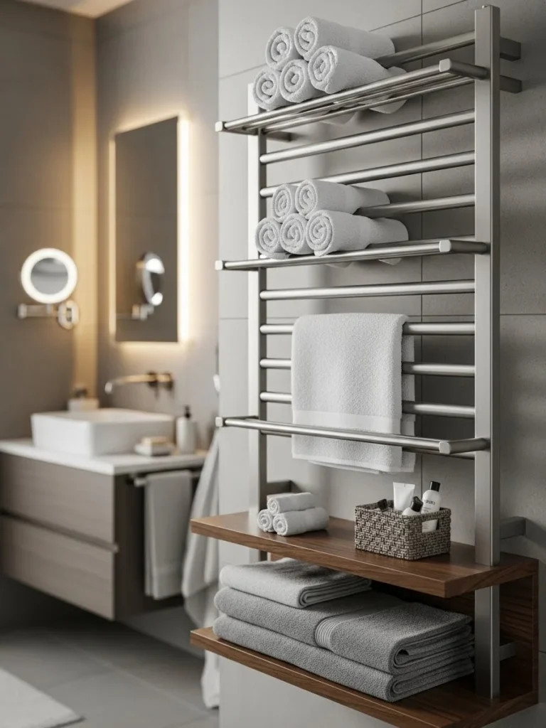 Towel warmers are already a luxurious bathroom feature, but combining them with storage adds functionality without sacrificing style. Heated racks can store towels, robes, or linens while keeping them warm and ready for use, enhancing comfort in small bathrooms.