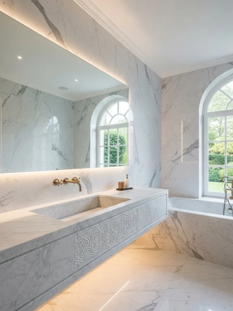 Statement lighting is often positioned above or beside the vanity, highlighting its form and craftsmanship. Soft illumination enhances the marble’s depth and elevates the overall ambiance.