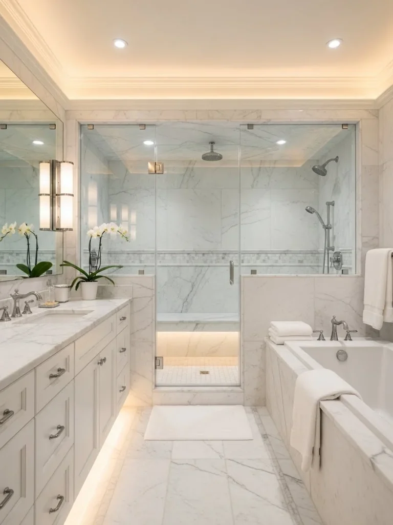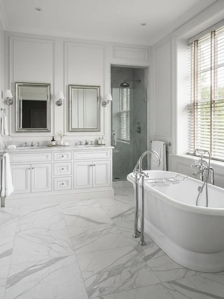 This elegant bathroom blends classic luxury with refined white marble finishes. Marble surfaces wrap the space in soft veining and luminous texture, creating an atmosphere of timeless sophistication. The design feels graceful and composed, evoking European-inspired elegance.