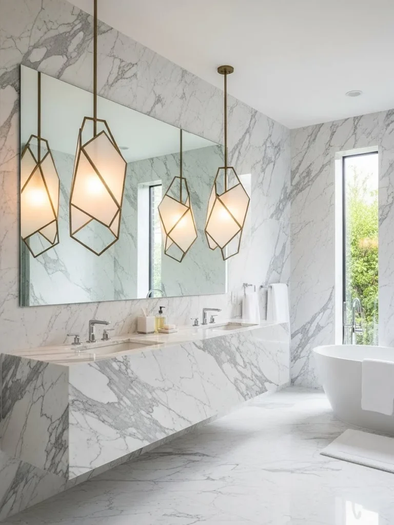 This bathroom offers a luxurious retreat that feels elevated yet serene. The combination of marble and statement lighting transforms the space into an elegant sanctuary designed for indulgent daily rituals.