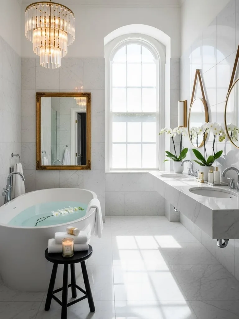 Editorial Luxury White Marble Bathroom Styled For Magazine
