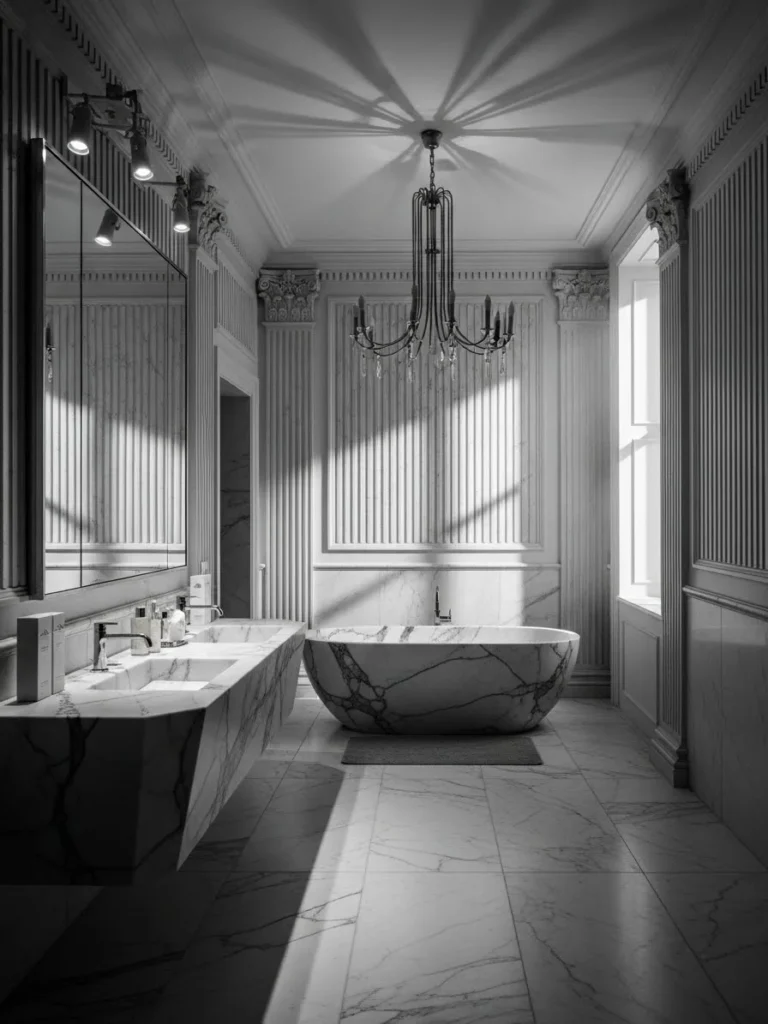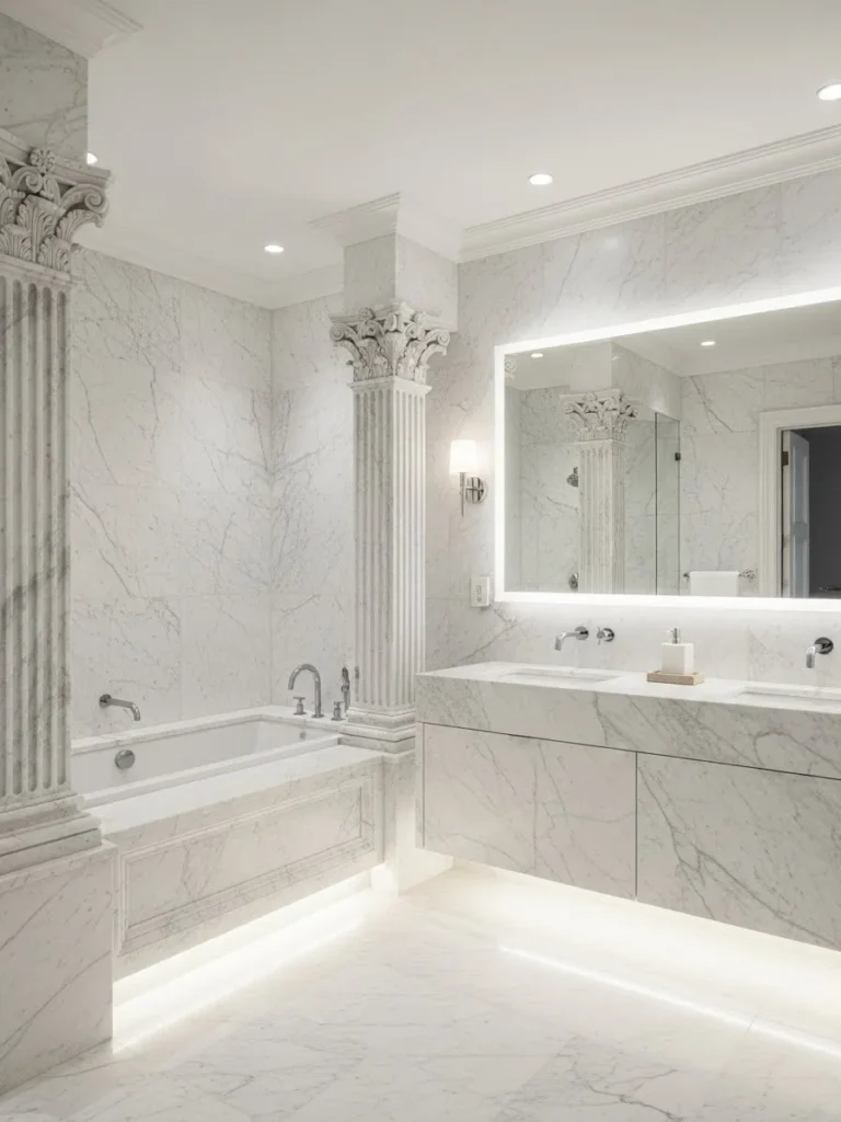 This museum-like bathroom treats white marble as a form of art. Architectural details and clean lines create a gallery-inspired environment that feels curated and refined. The space emphasizes proportion and material quality.