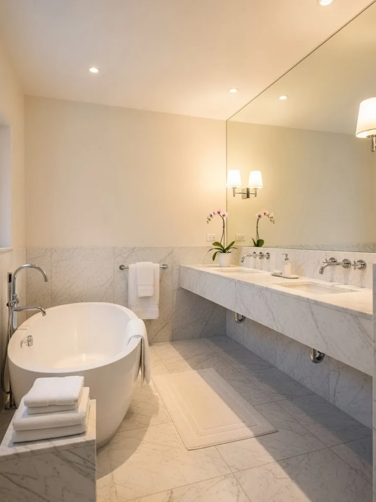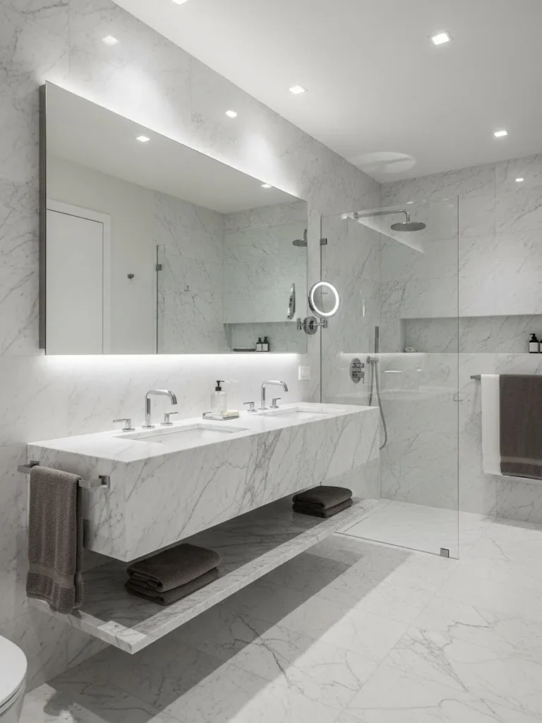 Lighting is balanced and flattering, designed to enhance both function and ambiance. Soft illumination highlights the marble’s texture while maintaining a calm, polished atmosphere.