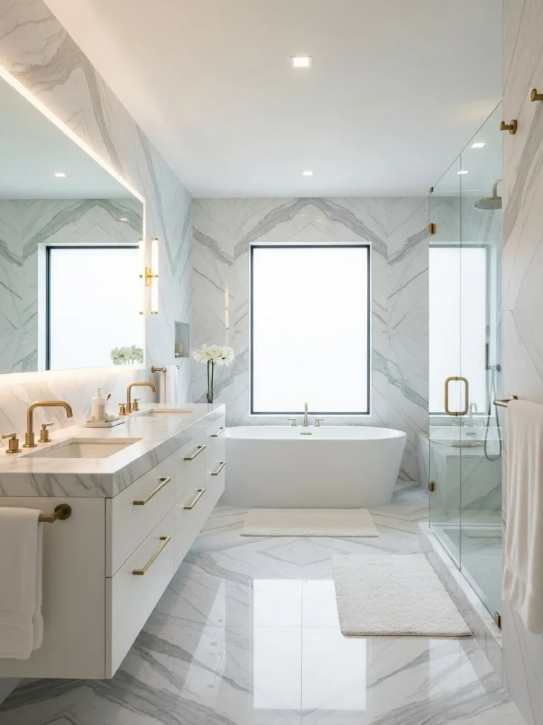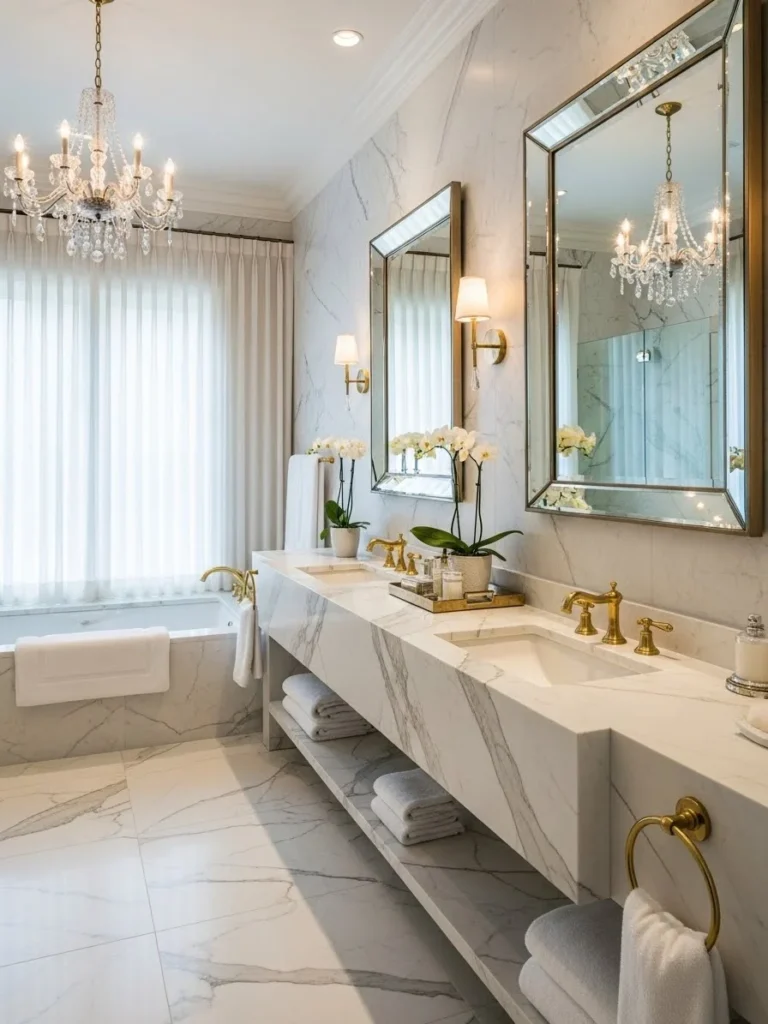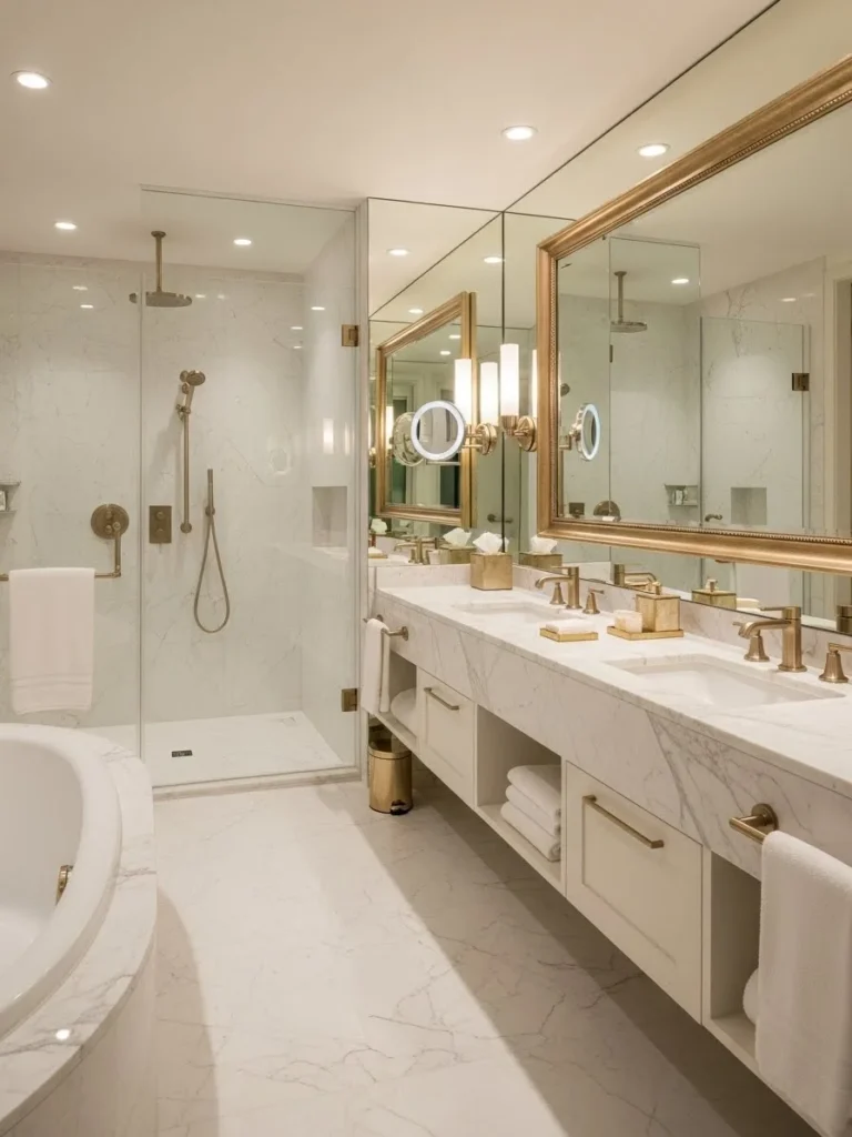This glamorous bathroom pairs luminous white marble with elegant gold fixtures. The marble provides a refined canvas, while metallic accents introduce warmth and sophistication. The design feels indulgent yet balanced.