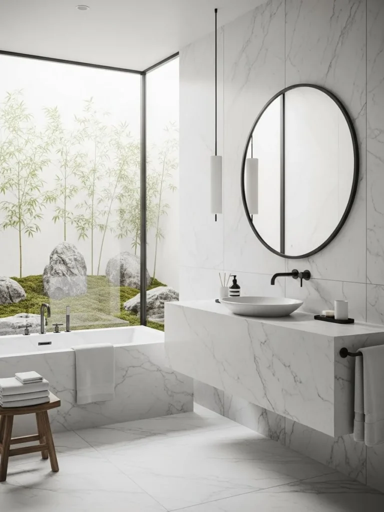 This Japanese-inspired bathroom blends minimalist principles with luxurious white marble. The design prioritizes balance, simplicity, and harmony, creating a calm and meditative environment. Marble surfaces are used with restraint and intention.