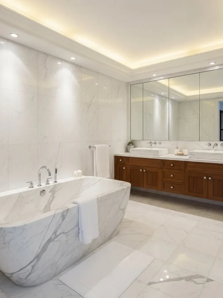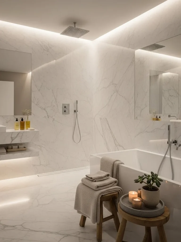 Soft ambient lighting is layered throughout the space, enhancing the spa-like mood. Light gently highlights the marble’s natural veining without harsh contrast, encouraging a sense of calm and escape from daily stress.