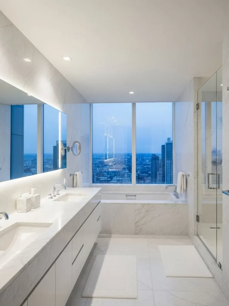 This penthouse bathroom is designed to celebrate light, scale, and luxury. Expansive white marble surfaces establish elegance, while floor-to-ceiling windows frame breathtaking panoramic views. The space feels open and elevated.