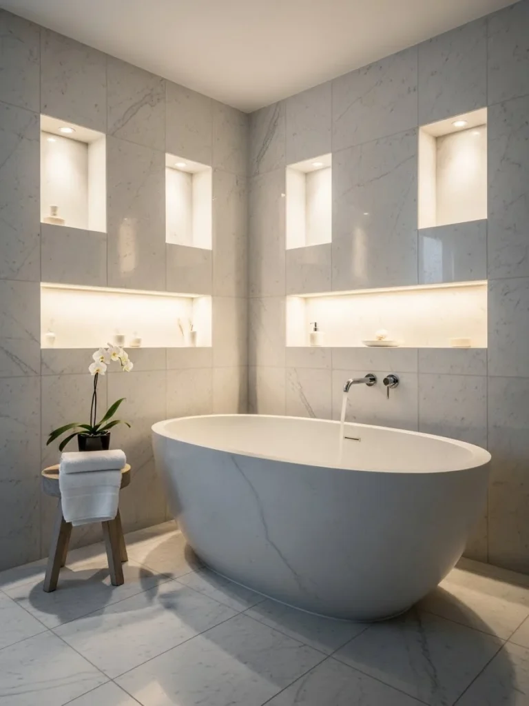 The niches are integrated seamlessly into marble walls, providing storage without disrupting the clean lines. Their placement enhances architectural rhythm within the space.