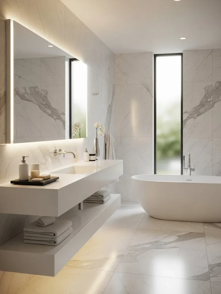 This ultra-modern bathroom is defined by seamless white marble surfaces and clean architectural lines. The design feels sleek, controlled, and visually uninterrupted. Marble wraps the space with precision and clarity.
