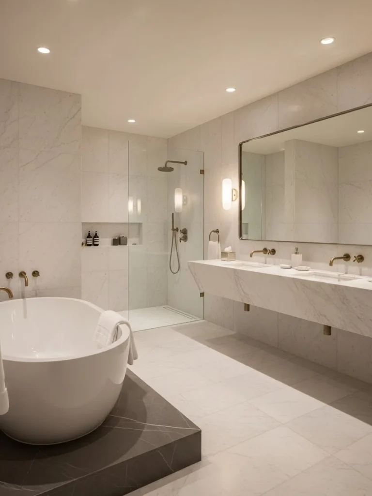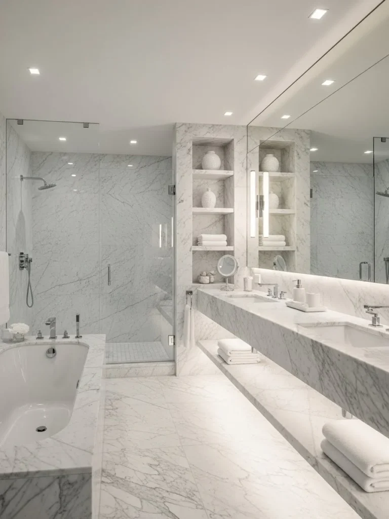 This quiet luxury bathroom is defined by restraint and refinement. White marble with soft, subtle veining creates a calm and understated foundation, allowing the material to speak without excess. The space feels composed and timeless.