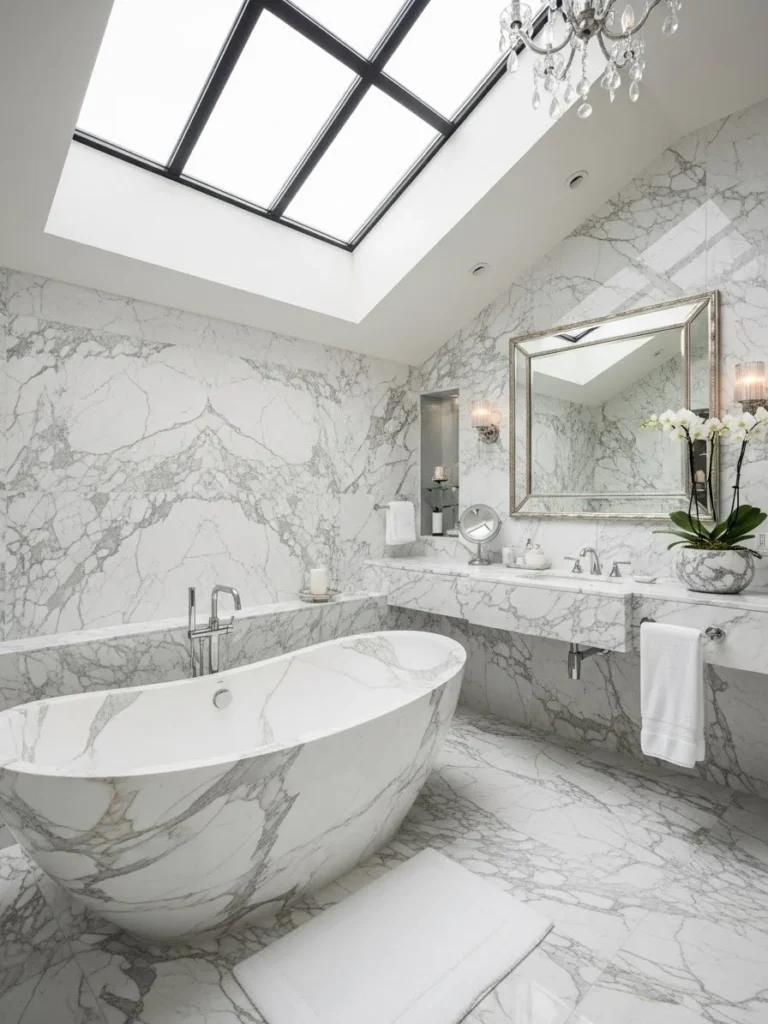A skylight above the tub introduces dramatic natural light, transforming the bathing experience throughout the day. Sunlight filters directly onto the tub, casting soft shadows and accentuating the marble’s natural veining. This connection to the outdoors adds depth and serenity.