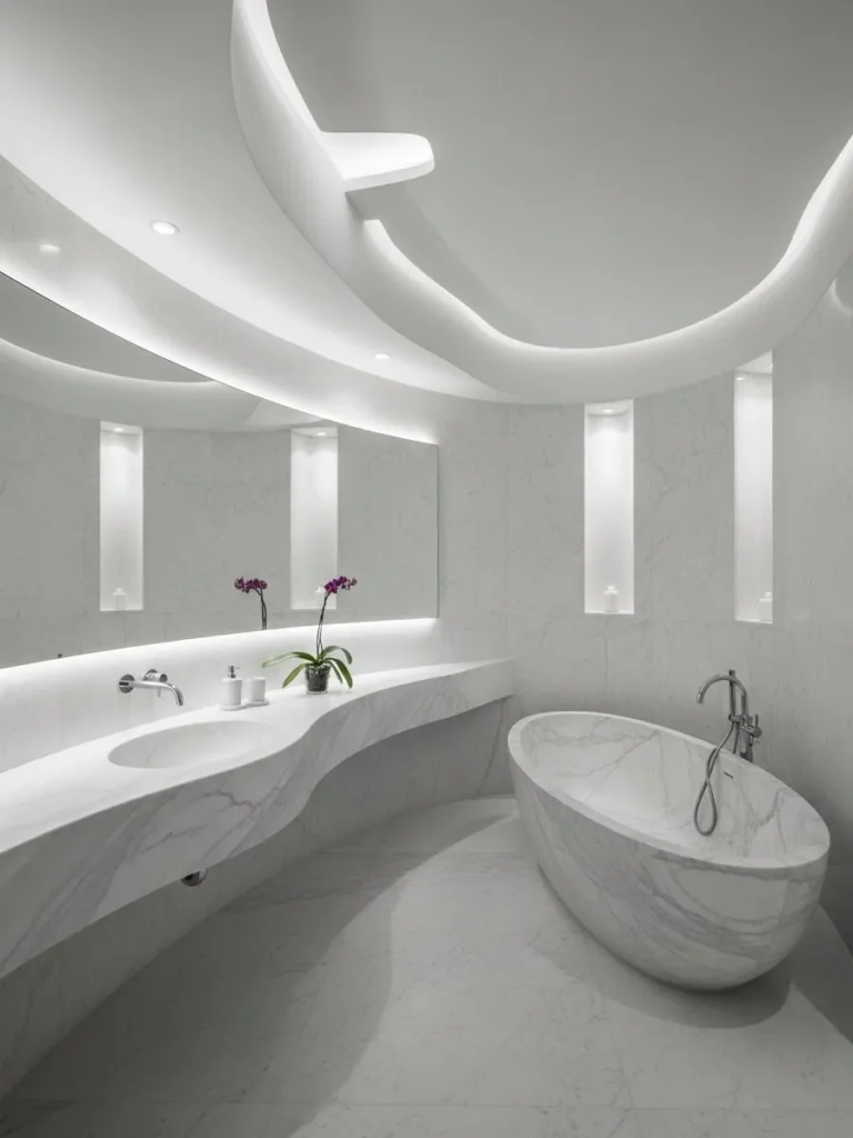 This sculptural bathroom features curved architectural elements wrapped in white marble. The flowing lines soften the space, creating a sense of movement and elegance. Marble enhances the sculptural quality.