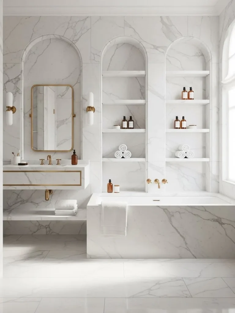 This timeless bathroom combines classic architectural elements with elegant white marble finishes. Arched niches introduce softness and character, creating a refined backdrop that feels both traditional and luxurious. Marble surfaces unify the design.