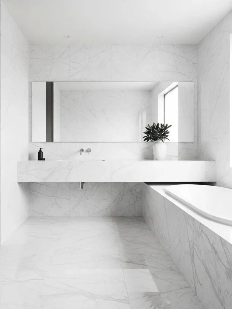 This monochromatic bathroom explores depth through layered white marble textures. Variations in finish and veining create visual interest while maintaining a cohesive palette. The result feels rich, calm, and sophisticated.