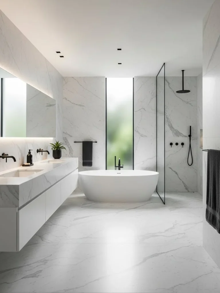 This contemporary bathroom contrasts crisp white marble with bold black accents. The marble establishes a clean, luminous foundation, while black elements introduce definition and modern edge.